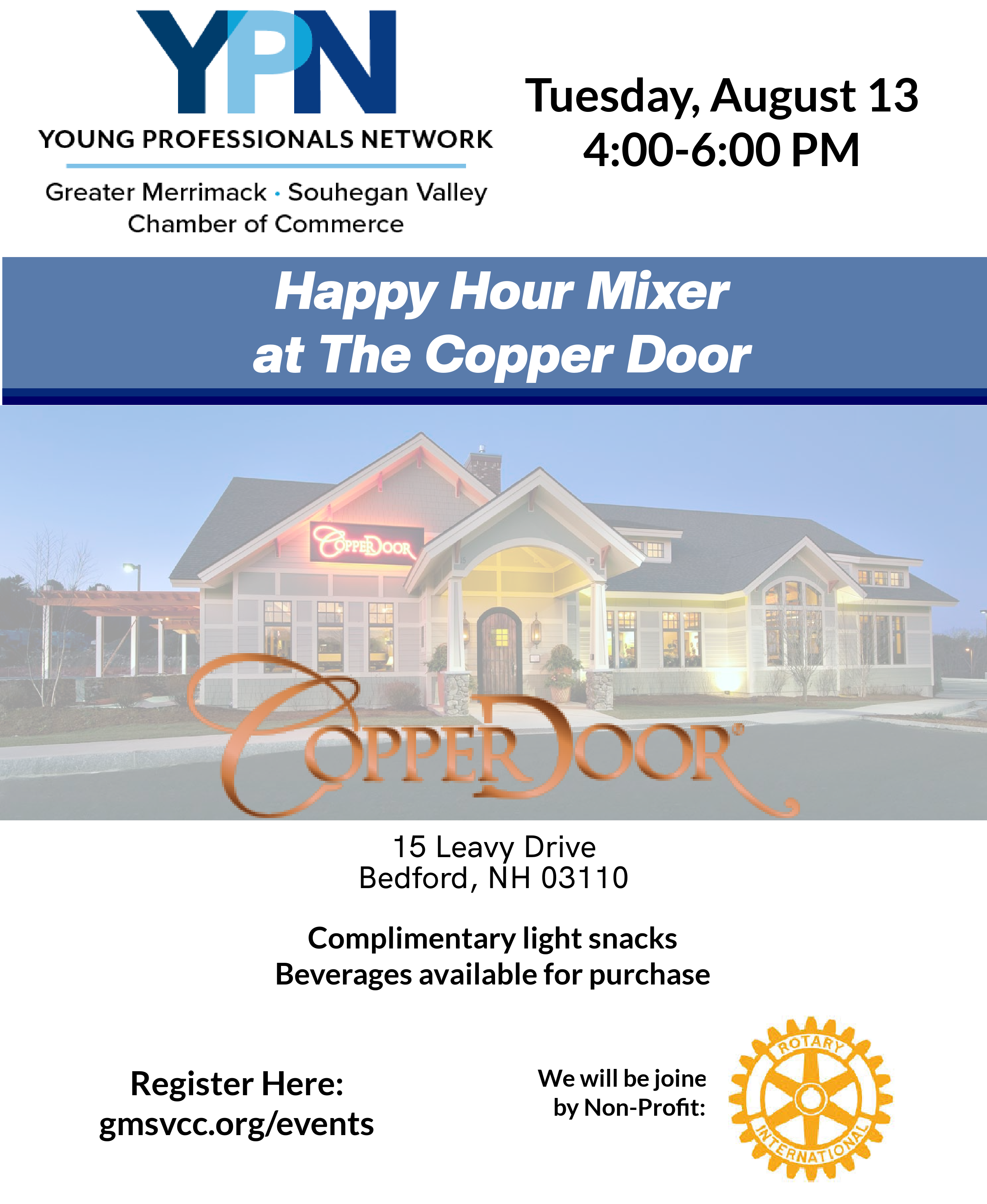 Join us for some great networking at The Copper Door in Bedford. Our Young Professionals Network of GMSVCC is a thriving group seeking to network and connect in a fun, relaxed atmosphere. We will be joined by members of the Merrimack Rotary, our August Non-Profit partner.